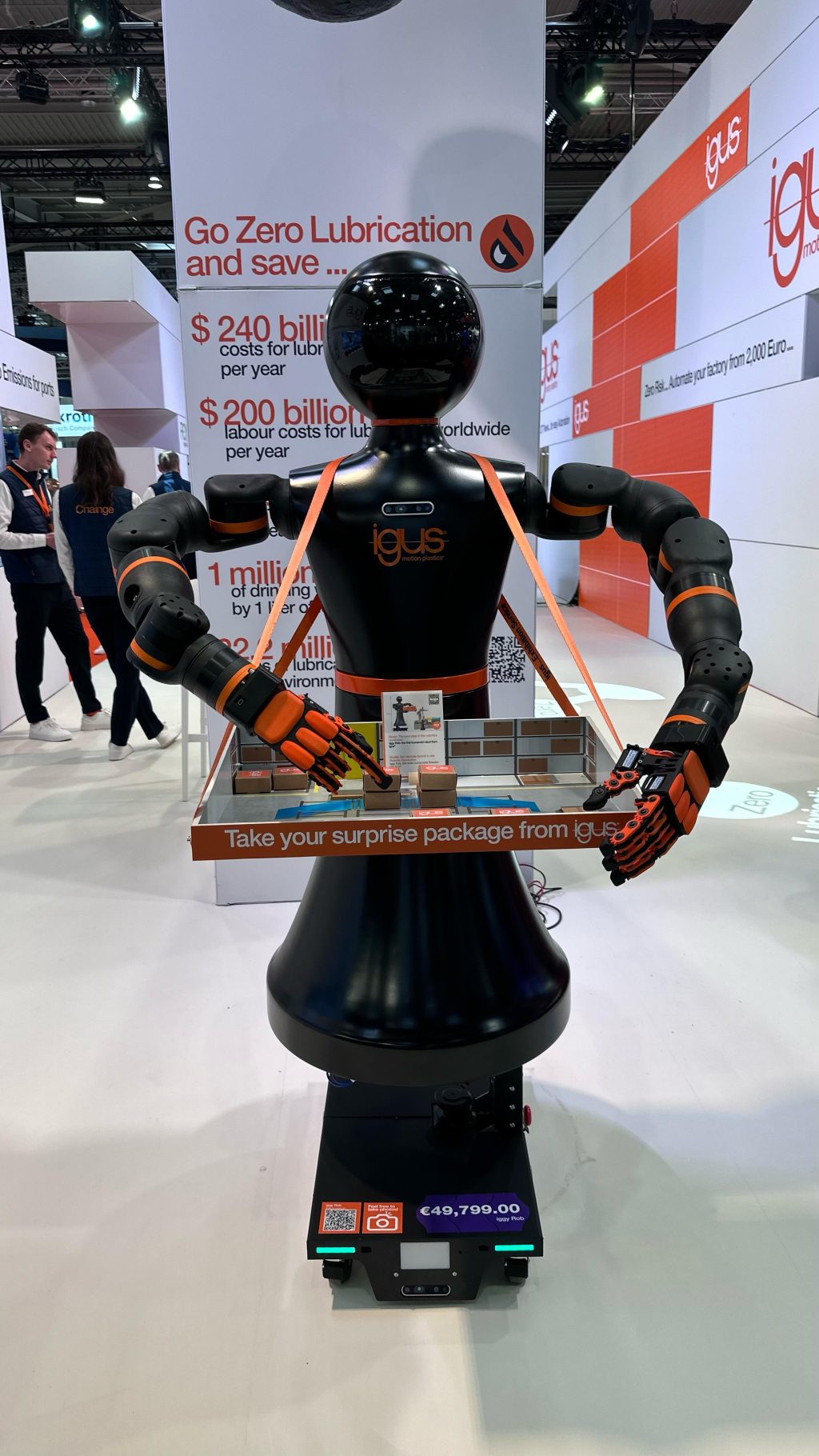 O Iggy Rob utiliza tecnologias de ponta e uma combinação de componentes poderosos, como os cobots ReBeL para o braço robótico e a base móvel ReBeLMove. Cria-se assim uma solução holística para movimentos fluidos e interações naturais, com uso flexível e independente de localização. Outros destaques da igus apresentados na feira incluem esteiras porta cabos certificadas para salas limpas, desenvolvidas em parceria com o instituto Fraunhofer, além de uma ampla gama de produtos como buchas e mancais autolubrificantes, guias lineares, cabos elétricos especiais, conectores e soluções para robótica e automação de baixo custo.